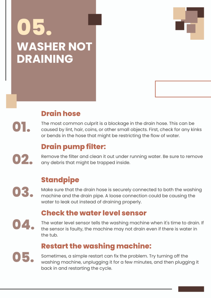 If your Hisense washing machine is not draining water properly, there are several potential causes that should be considered. One possibility is a clogged drain hose, which can prevent water from flowing properly out of the machine. Additionally, a blocked drain pump filter could also result in improper drainage, as it restricts the flow of water through the system. Lastly, a faulty drain pump could also cause drainage issues, as it may not be functioning properly.