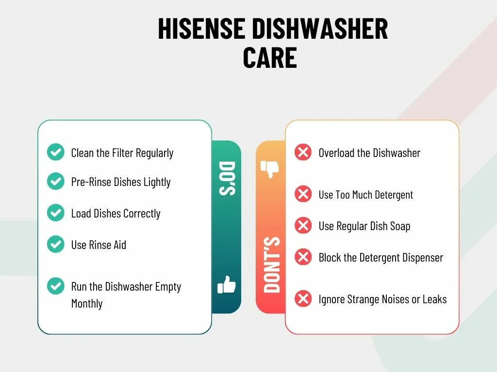 Refer to your Hisense dishwasher manual for proper loading instructions and recommended detergent usage. Avoid overloading the dishwasher and ensure dishes are placed correctly for optimal cleaning.