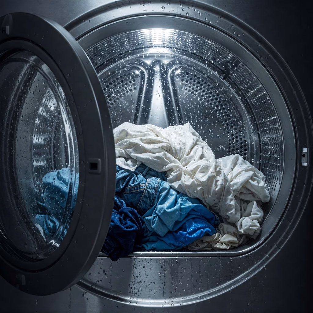 Image of a tumble dryer with wet clothes inside due to a faulty belt, highlighting the need for a replacement.