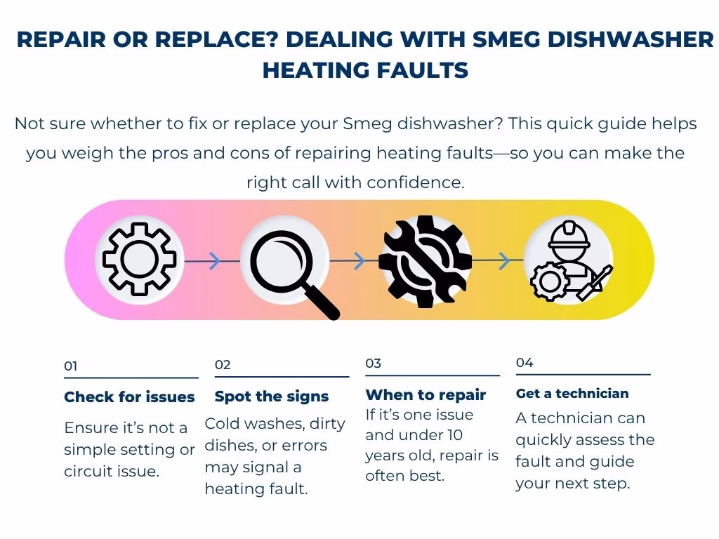 Diagram outlining common SMEG dishwasher heating issues, including faulty heating elements, thermostats, and wiring problems.