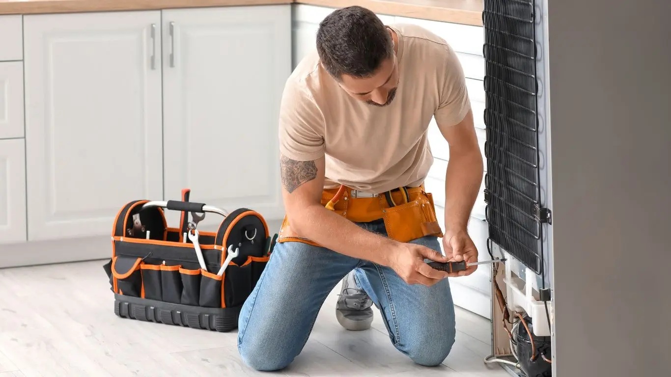 Technician repairing a Defy refrigerator in a Durban kitchen.