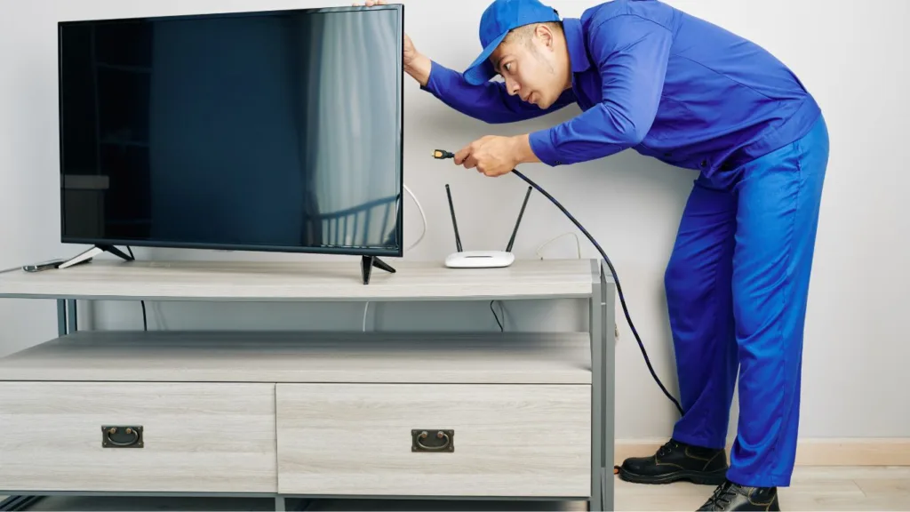 technician repairing a resident’s Samsung TV in Umhlanga home, offering professional in-home service to restore appliance functionality.